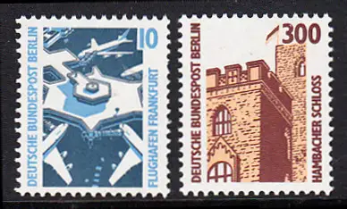 BERLIN 1988 Michel-Nummer 798-799 postfrisch SATZ(2) EINZELMARKEN - Sehenswürdigkeiten: Flughafen Frankfurt/Main / Hambacher Schloss