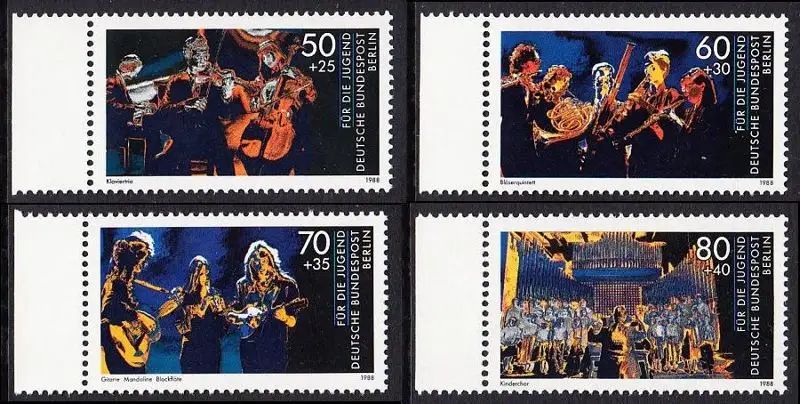 BERLIN 1988 Michel-Nummer 807-810 postfrisch SATZ(4) EINZELMARKEN RÄNDER links - Wettbewerb Jugend musiziert