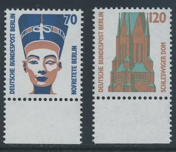 BERLIN 1988 Michel-Nummer 814-815 postfrisch SATZ(2) EINZELMARKEN RÄNDER unten - Sehenswürdigkeiten: Nofretete-Büste, Berlin / St.-Petri-Dom, Schleswig