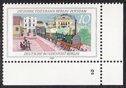 BERLIN 1988 Michel-Nummer 822 postfrisch EINZELMARKE ECKRAND unten rechts (FN/b) - Eisenbahn Berlin-Potsdam