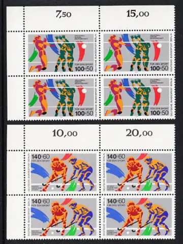 BERLIN 1989 Michel-Nummer 836-837 postfrisch SATZ(2) BLÖCKE ECKRAND oben links - Sporthilfe: Volleyball-Europameisterschaften der Damen, Hamburg, Karlsruhe und Stuttgart / Hockey Champions Trophy, Berlin