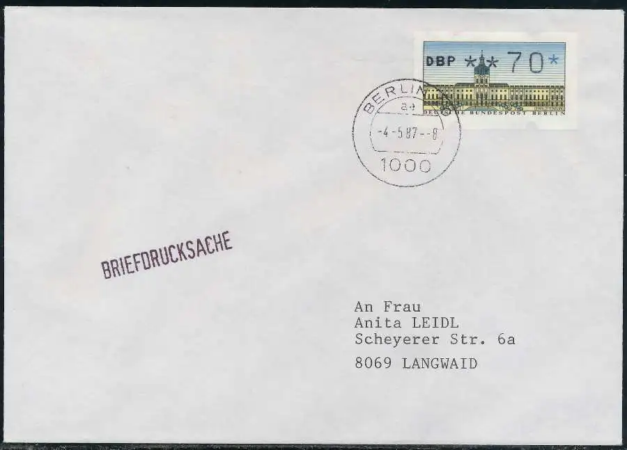 070 Pfg Wert aus der ATM-Ausgabe von 1987, FDC, auf Briefdrucksache