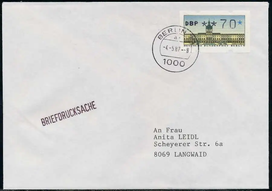 070 Pfg Wert aus der ATM-Ausgabe von 1987, FDC, auf Briefdrucksache