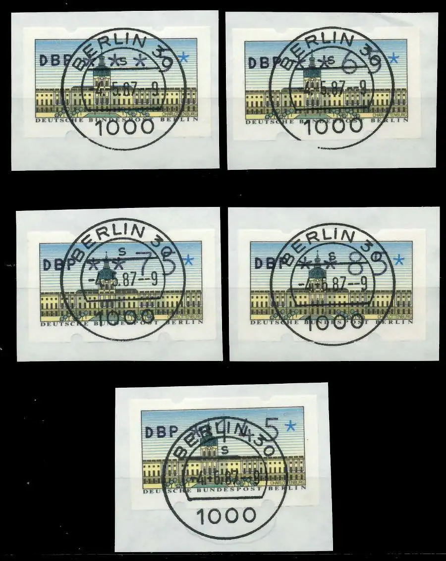ATM-Ausgabe von 1987 Versandstellen Satz VS2, mit zentrischem Berlin Tagesstempel vom Ersttag