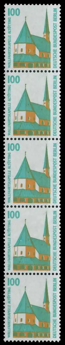 100 Pfg Wert aus der Berlin-Dauerserienausgabe Sehenswürdigkeiten als 5er Streifen, ein Wert mit rückseitiger Nummer 475