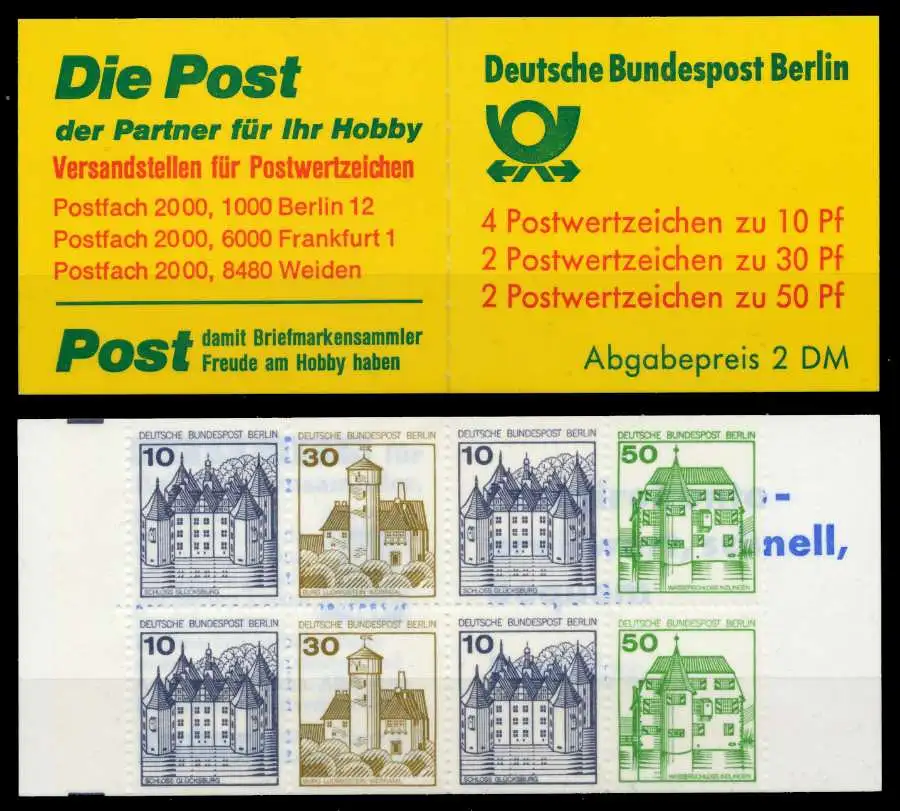 Berlin Burgen und Schlösser Markenheftchen 11 (10+30+10+50), Reklame EBEL / Postgirokonto