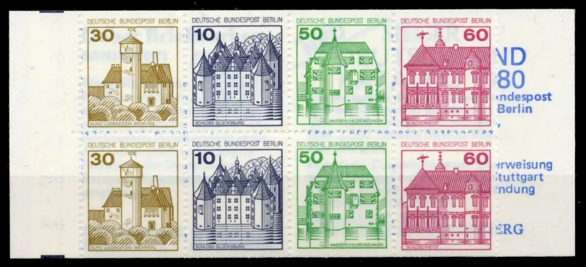 Berlin Burgen und Schlösser Markenheftchen 12a (30+10+50+60), Originalabbildung des Heftchenblattes. Die grauen Schnittbalken sind durch die Einfärbung des Hintergrundes teilweise geschwärzt (also keine Besonderheit)