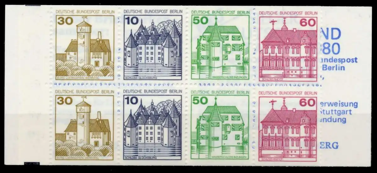 Berlin Burgen und Schlösser Markenheftchen 12a (30+10+50+60), Originalabbildung des Heftchenblattes. Die grauen Schnittbalken sind durch die Einfärbung des Hintergrundes teilweise geschwärzt (also keine Besonderheit)