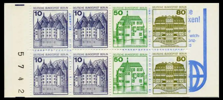 Burgen und Schlösser Markenheftchen 13 (10+10+50+80), oben und unten geschnitten, mit Bogennummer am Heftchenblattrand (siehe Abbildung)