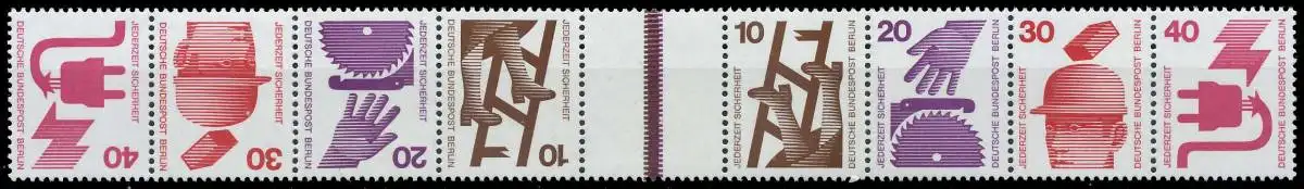Streifen aus den Zusammendrucken Unfallverhütung Berlin 403 + 404 + 406 + 407, rechte Seite vom Heftchenblatt KZ5 + zwei mal W49, 8er Streifen (MichelNr.: 1074005, 403, 404, 406, 407)