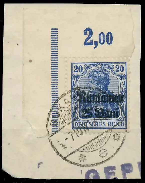 25 Bani auf 20 Pfg Aufdruckausgabe Deutsche Militärverwaltung in Rumänien auf den Freimarken des deutschen Reiches (Germania 1916/1918) - Aufdruck Rumänien (Frakturschrift) und neue Wertangabe (violettblau)