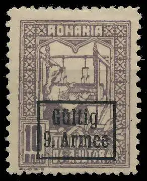 10 Bani Kriegssteuermarke (Deutsche Besetzung Rumänien), grauviolett, mit Aufdruck "Gültig für 9. Armee" (Fiskalmarke), großer Falzrest