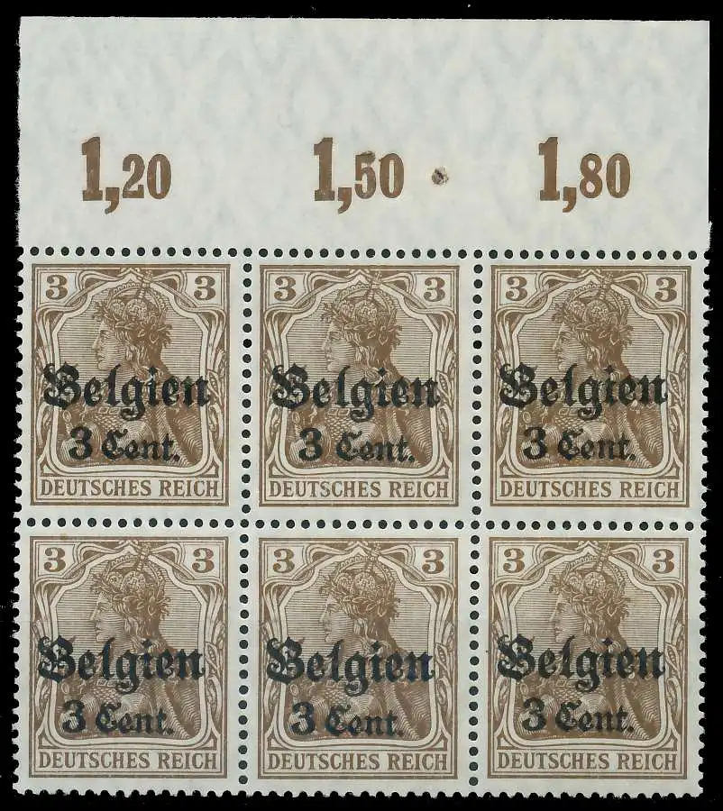 3 Cent auf 3 Pfg Wert aus der Aufdruckausgabe Landespost in Belgien (Generalgouvernement) auf den Freimarken des deutschen Reiches (Germania 1916/1918), mit kurzem Aufdruck im 6er Block, Plattendruck mit Oberrand. Die mittlere obere Marke ist vom Type III mit Abstand 1,2mm, die anderen Marken vom Type I mit 0,8mm Abstand, somit ergeben sich unterschiedlichen Typenpaare, bzw. 3er Streifen, im Michel keine Bewertung für Typenpaare. Die Type III Marke ist tiefst signiert HEY, alle Marken und Randbereiche einwandfrei postfrisch.