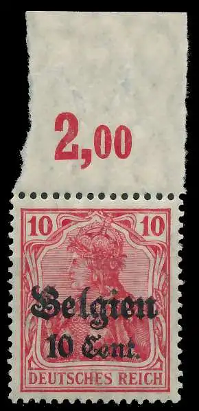 10 Cent auf 10 Pfg Wert aus der Aufdruckausgabe Landespost in Belgien (Generalgouvernement) auf den Freimarken des deutschen Reiches (Germania 1916/1918), mit kurzem Aufdruck, Marke postfrisch, im Oberrand Falzrest