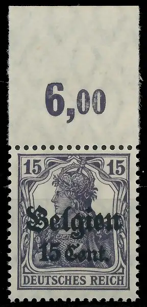 15 Cent auf 15 Pfg Wert aus der Aufdruckausgabe Landespost in Belgien (Generalgouvernement) auf den Freimarken des deutschen Reiches (Germania 1916/1918), mit kurzem Aufdruck