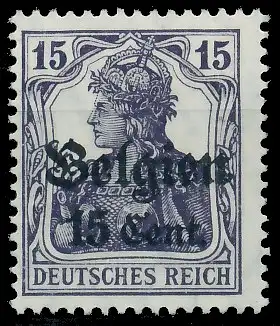 15 Cent auf 15 Pfg Wert aus der Aufdruckausgabe Landespost in Belgien (Generalgouvernement) auf den Freimarken des deutschen Reiches (Germania 1916/1918), mit kurzem Aufdruck
