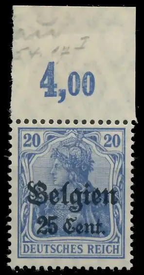 25 Cent auf 20 Pfg Wert aus der Aufdruckausgabe Landespost in Belgien (Generalgouvernement) auf den Freimarken des deutschen Reiches (Germania 1916/1918), mit kurzem Aufdruck, Marke postfrisch, Oberrand mit Falzspuren / Knitter, vorderseitig beschriftet
