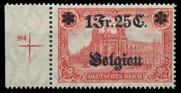 1 Franc 25 C auf 1 Mark Wert aus der Aufdruckausgabe Landespost in Belgien (Generalgouvernement) auf den Freimarken des deutschen Reiches (Germania 1914/1918), Seitenrand mit Passerkreuz und Nummer, Line leicht gefaltet, rückseitig zwei Falzreste