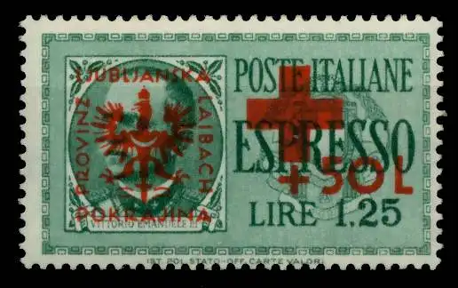 1,25L + 50L Wert aus der Aufdruckausgabe Eilmarken von Italien mit Aufdruck des Krainer Wappenadlers und rotes Kreuz