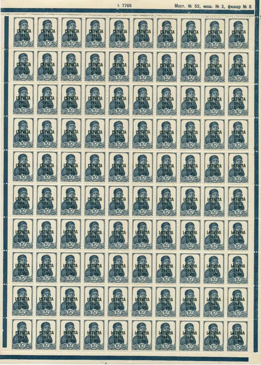 10K Wert aus der Aufdruckausgabe Lettland (Landespost während der deutschen Besetzung) im kpl. 100er Bogen, Oberrandlinie teilweise gebrochen. Bogen jeweils senkrecht und waagerecht mittig gefaltet.