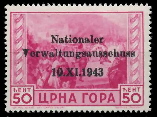 50 Cmi Freimarkenausgabe von Montenegro mit 3-zeiligem Aufdruck "Nationaler Verwaltungsausschuss 10.XI.1943"