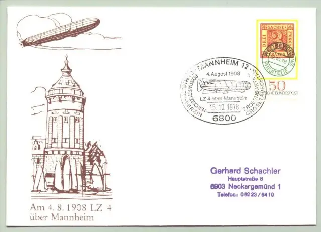 BF. MA Zeppelin 1978 (intern : 1019463) Artikelbeschreibung u. Zustand : Siehe Scan. Weitere Infos : Sehr schoener Heimatbeleg aber auch etwas fuer den Philatelisten ? Sonderbriefkuvert : "LZ 4 ueber Mannheim 1908". PLZ-Bereich pauschal 68163. Mit Sonderstempel vom 15. 10. 1978