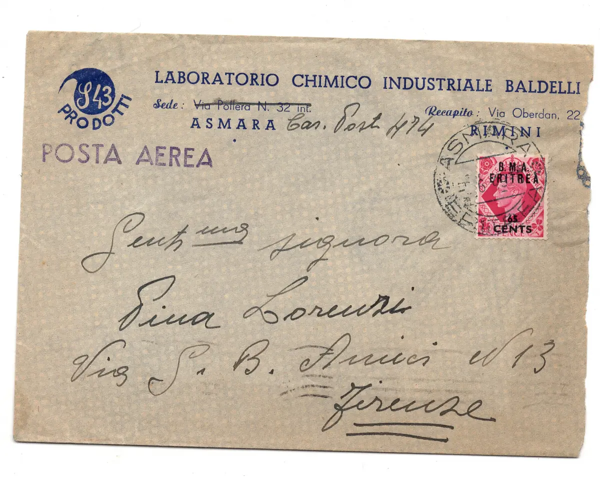 Umschlag - B.M.A. Eritrea - 65 Cent. Nr. 8 isoliert auf Luftumschlag von Asmara nach Florenz am 6.6.49 mit Anreiseannullierung - Ungewöhnlich - Kat. euro 100 Cod. 2819/WEB