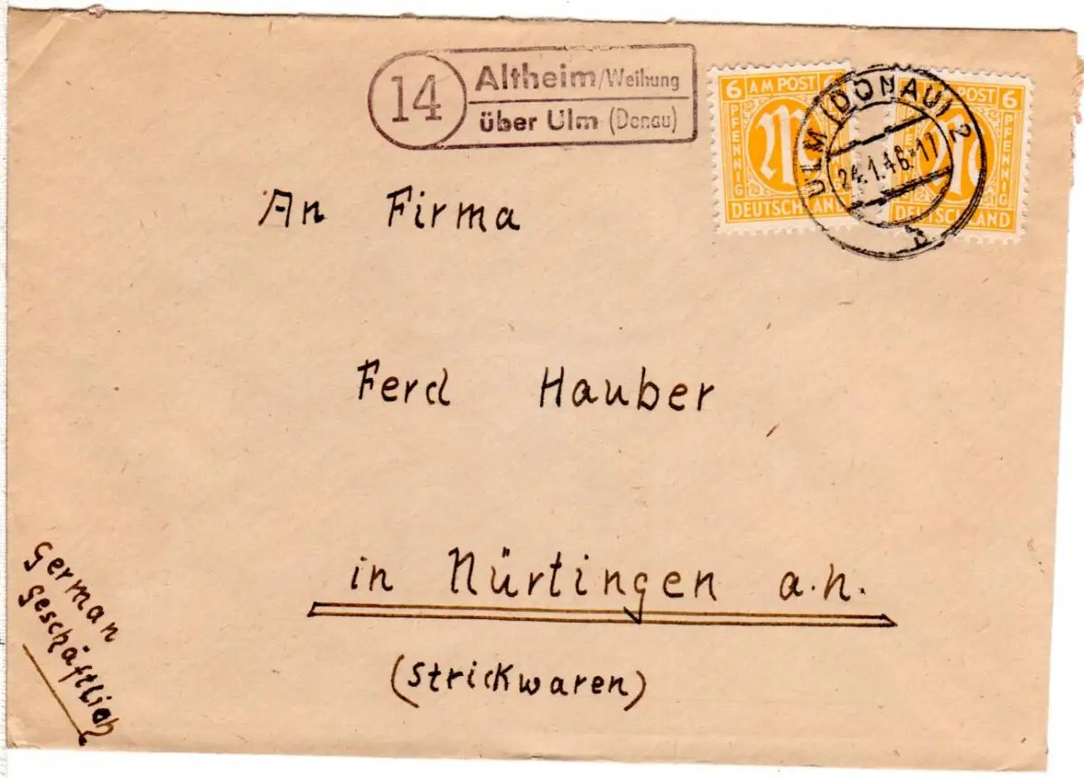 BRD 1946, Landpoststempel 14 ALTHEIM/WEIHUNG über Ulm auf Brief m. 2x6 Pf.