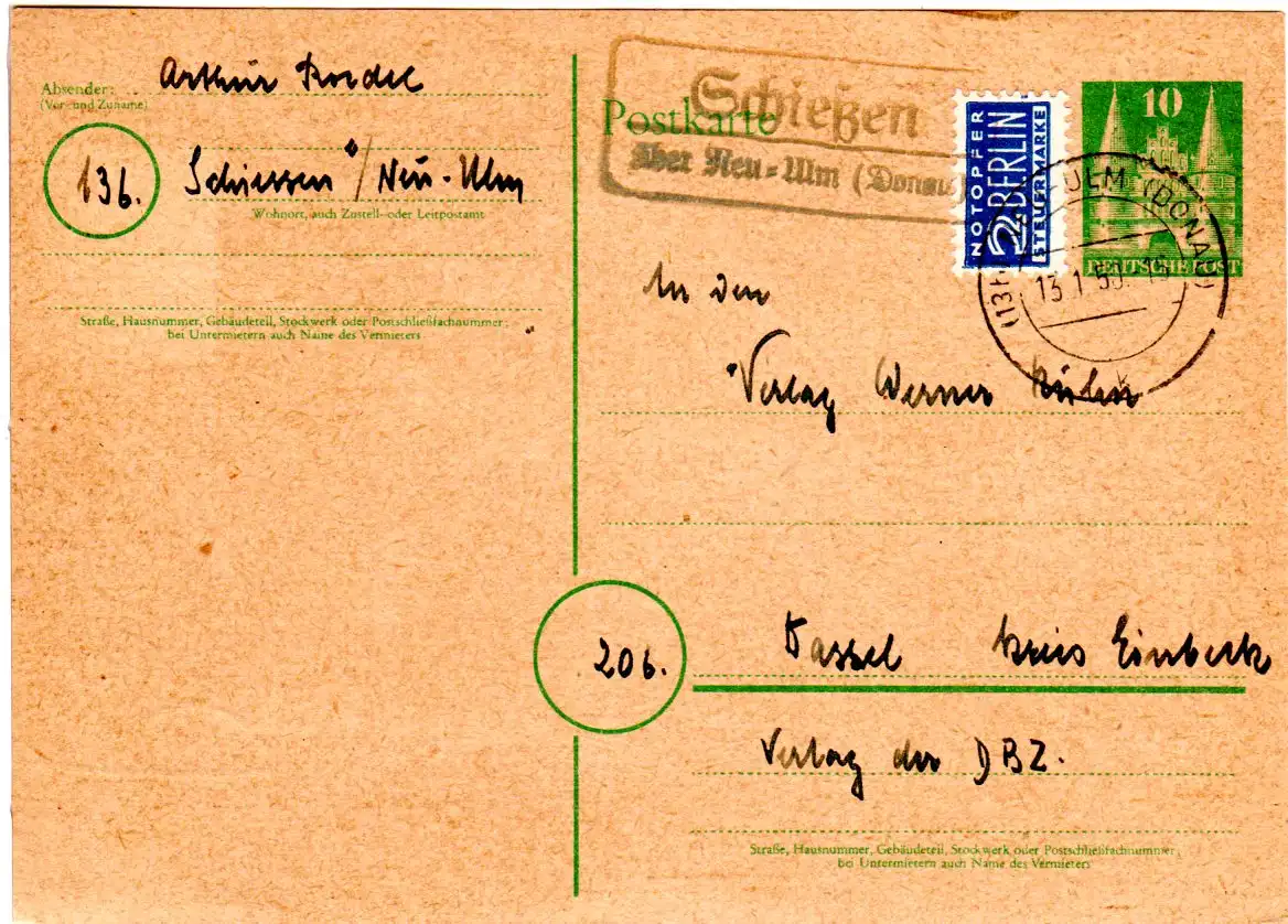 BRD 1950, Landpost Stpl. Schiessen über Neu-Ulm auf 10 Pf. Ganzsache