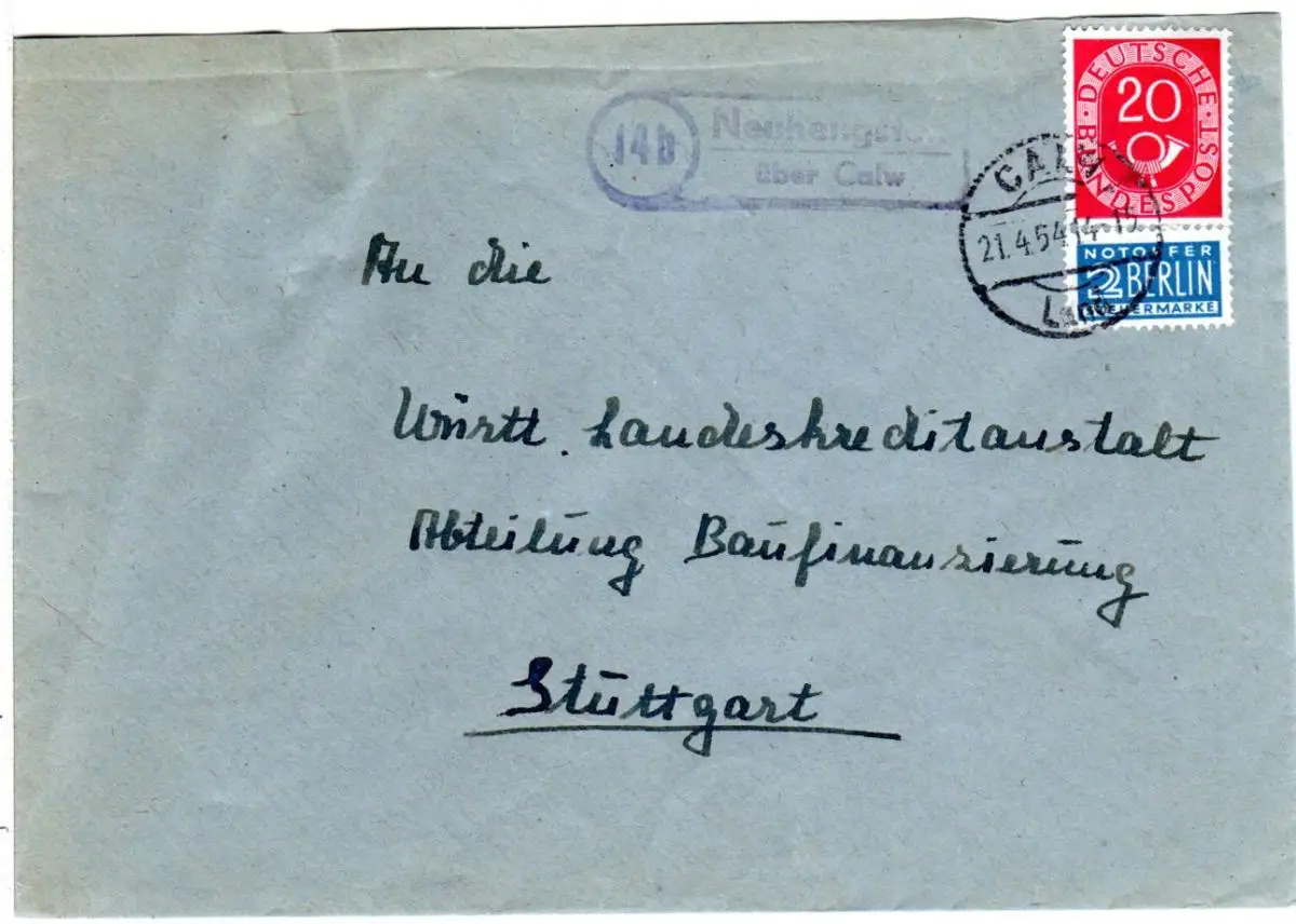 BRD 1954, Landpost Stpl. 14b NEUHENGSTETT über Calw auf Brief m. 20 Pf.