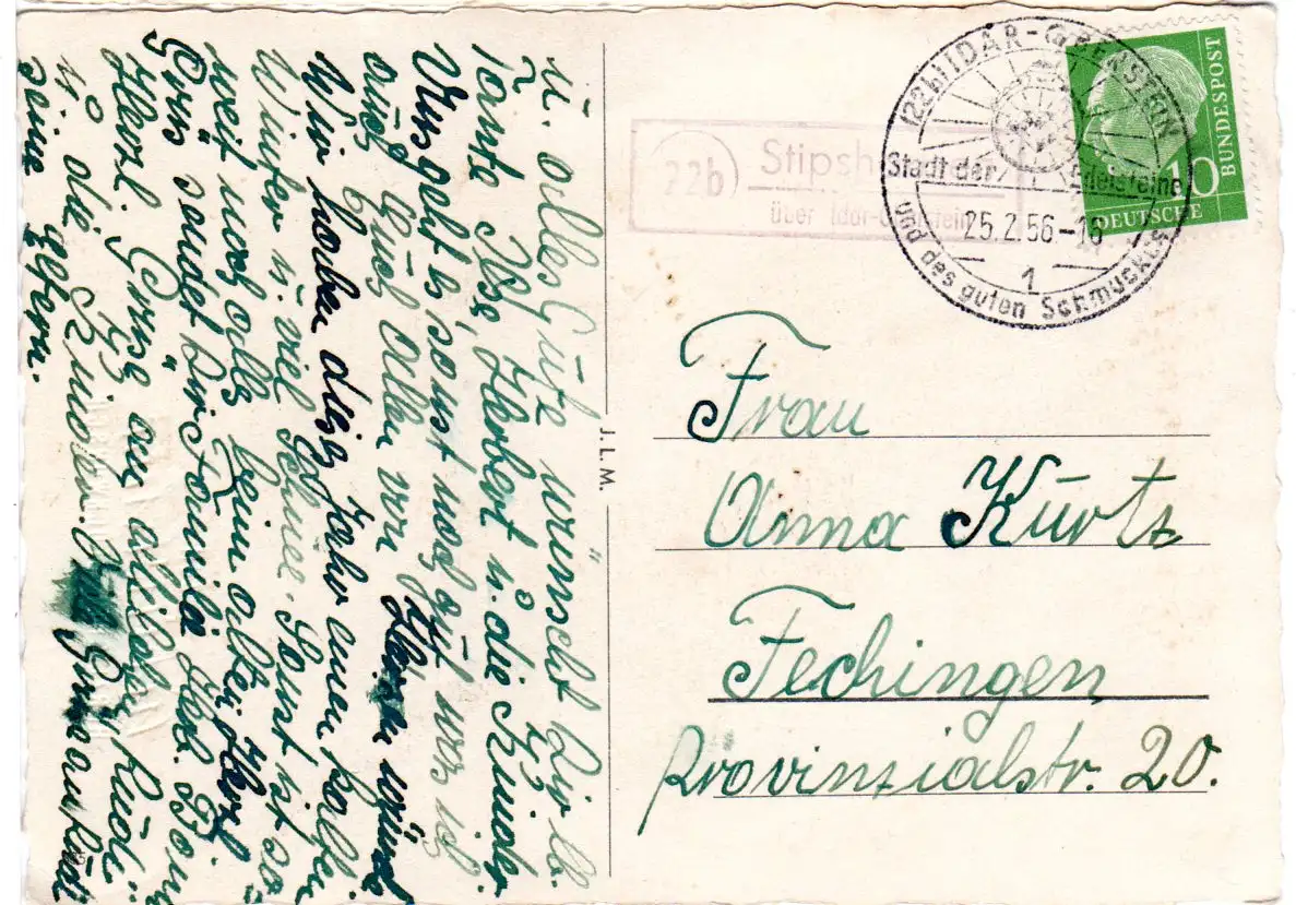 BRD 1956, Landpost Stpl. 22b STIPSHAUSEN über Idar-Oberstein auf Karte m. 10 Pf