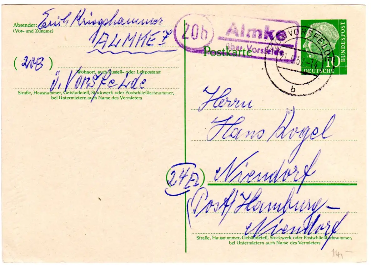 BRD 1957, Landpoststpl. 20b ALMKE über Vorsfelde auf 10 Pf. Ganzsache