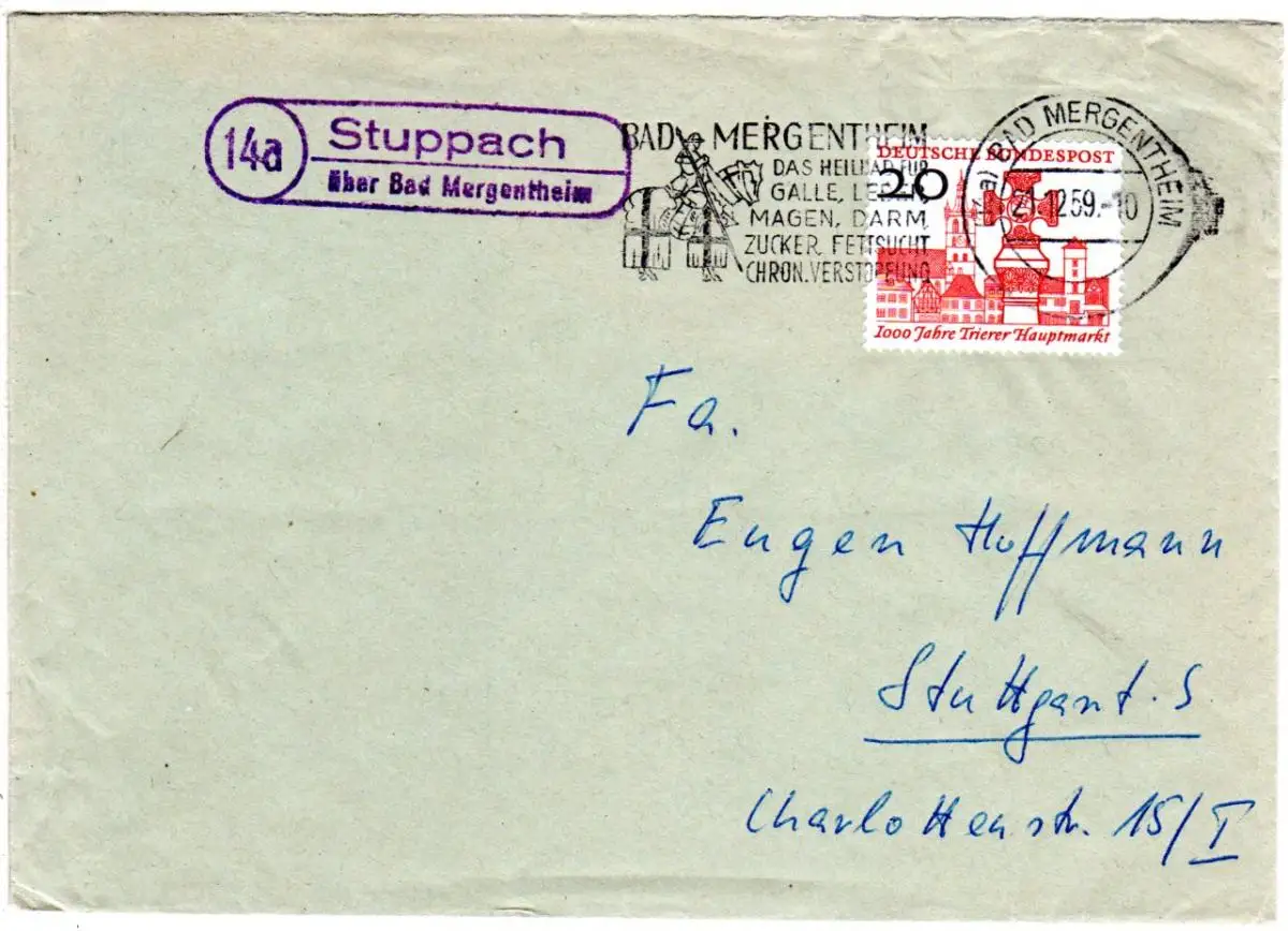 BRD 1959, Landpoststempel 14a STUPPACH über Bad Mergentheim auf Brief m. 20 Pf.