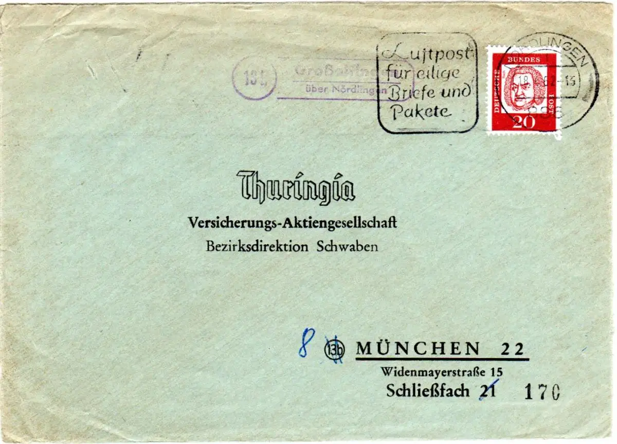 BRD 1962, Landpost Stpl. 13b GROSSEHINGEN über Nördlingen auf Brief m. 20 Pf.