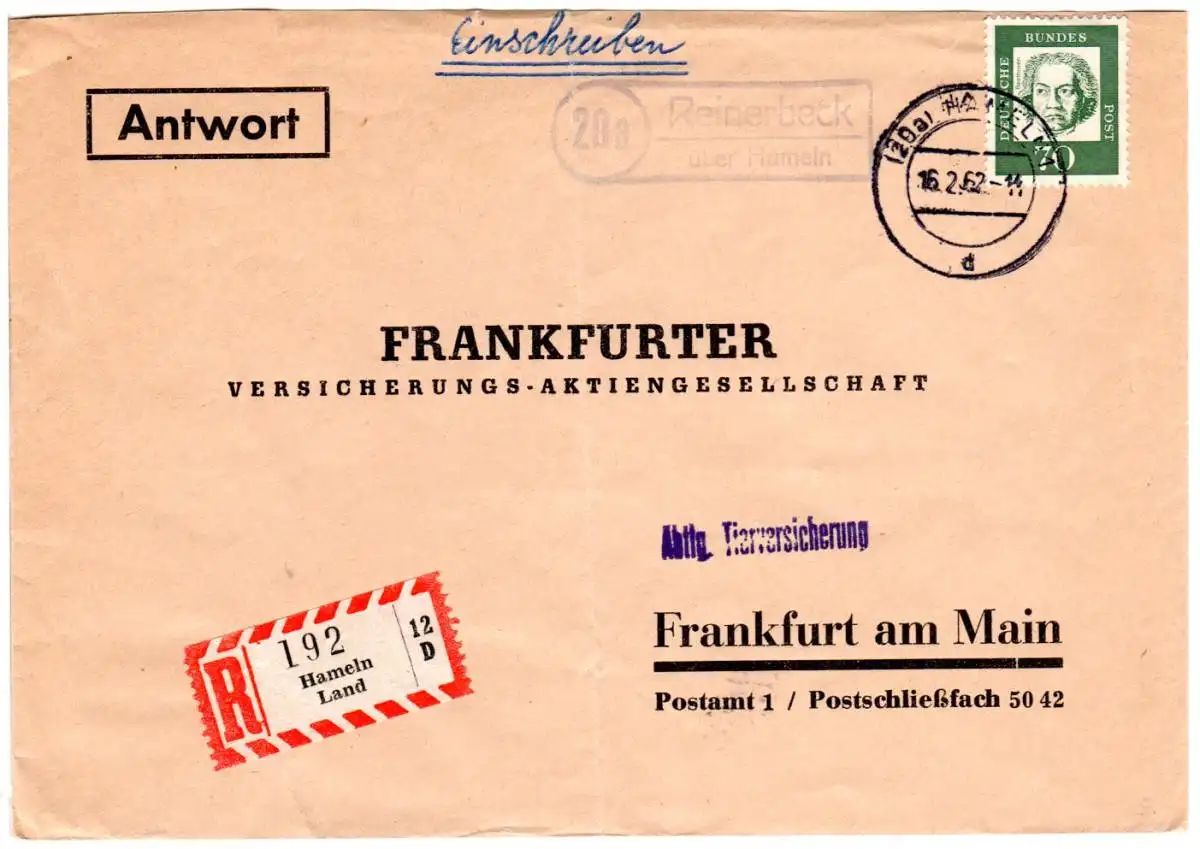BRD 1962, Landpost Stpl. 20a REINERBECK über Hameln auf Reko-Brief m. 70 Pf.