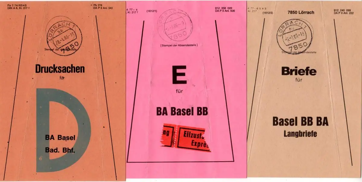 BRD 1986, Lörrach, 3 Briefbundfahnen f. Sendungen n. Basel Bad. Bahnhof, Schweiz