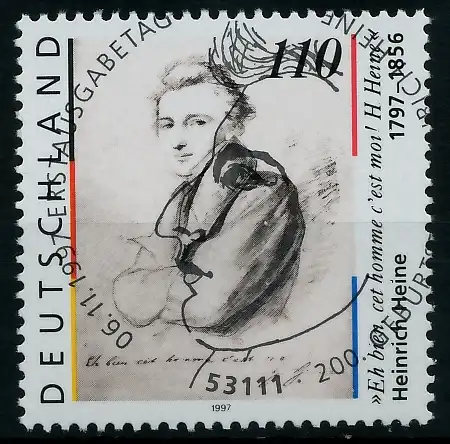 200. Geburtstag von Heinrich Heine (Aus Bogen mit Runen), 1. Auflage, bläulich grünlich floureszierend, Ersttagssonderstempel