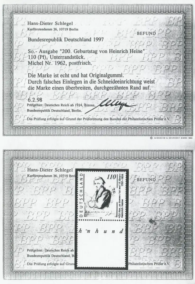 200. Geburtstag von Heinrich Heine, mit anhängendem Leerfeld unten, mit Attestkopie