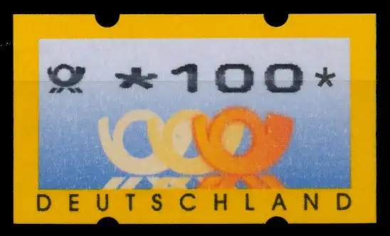 1,00 DM Wert aus der ATM Ausgabe von 1999, mit Posthornlogo und Postlogo-Eindruck in der Wertbezeichnung, fette Schrift mit schmalem Abstand zwischen der Ziffern