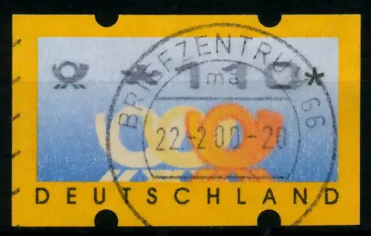 1,10 DM Wert aus der ATM Ausgabe von 1999, mit Posthornlogo und Postlogo-Eindruck in der Wertbezeichnung, fette Schrift mit schmalem Abstand zwischen der Ziffern