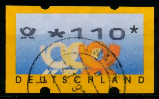 1,10 DM Wert aus der ATM Ausgabe von 1999, mit Posthornlogo und Postlogo-Eindruck in der Wertbezeichnung, fette Schrift mit schmalem Abstand zwischen der Ziffern