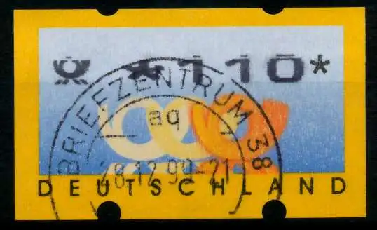 1,10 DM Wert aus der ATM Ausgabe von 1999, mit Posthornlogo und Postlogo-Eindruck in der Wertbezeichnung, fette Schrift mit schmalem Abstand zwischen der Ziffern