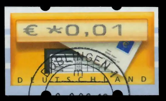 0,01 Euro Wert aus der ATM Ausgabe von 2002, mit Briefkastenlogo, Werteindruck 28mm lang