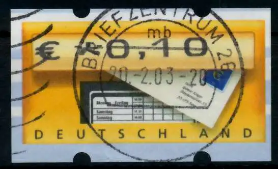 0,10 Euro Wert aus der ATM Ausgabe von 2002, mit Briefkastenlogo, Werteindruck 28mm lang