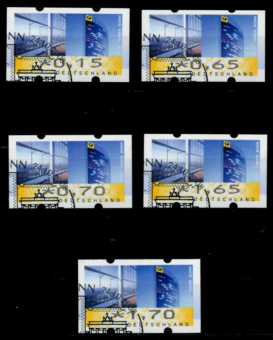 ATM Ausgabe von 2008, mit Post-Tower, Werte nach VS1 (0,15, 0,65, 0,70, 1,65, 1,70), ohne rückseitige Nummer