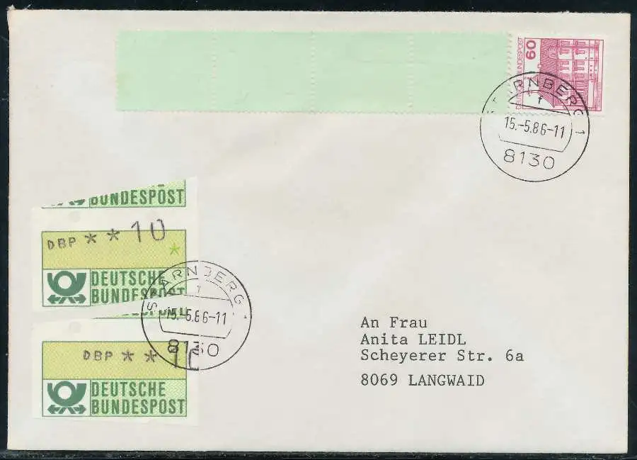 Normalbrief mit ATM1-010, sogenannter "Starnberger Reiter bzw. Starnberger Springer", beiliegend Quittung des Automaten mit Datum 15.05.1986, mit zusätzlich 60 Pfg Rollenanfang aus der Serie Burgen und Schlösser.