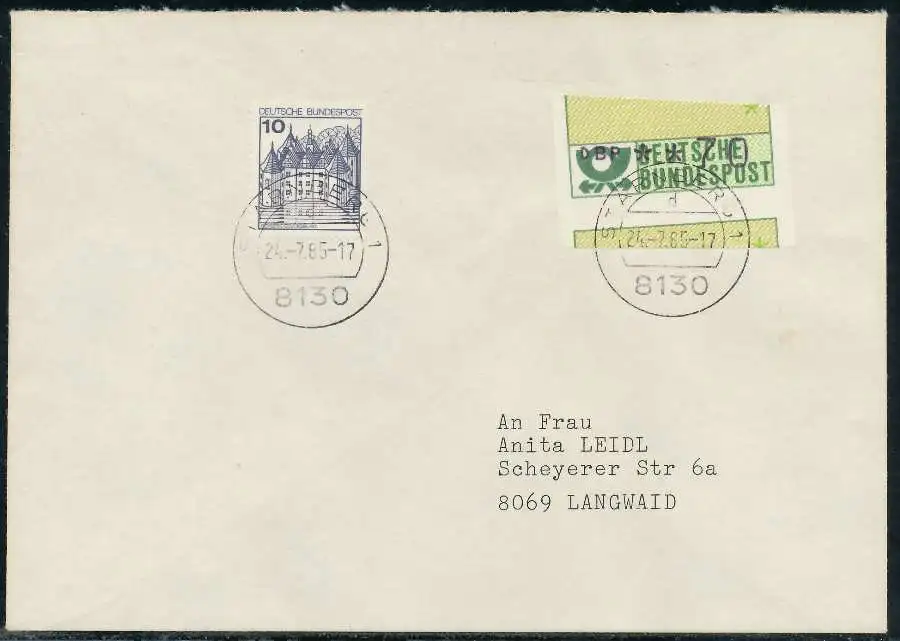Normalbrief mit ATM1-070, sogenannter "Starnberger Reiter bzw. Starnberger Springer", beiliegend Quittung des Automaten mit Datum 24.07.1985, mit zusätzlich 10 Pfg aus der Serie Burgen und Schlösser.