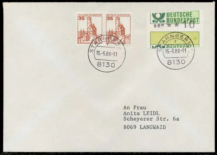 Normalbrief mit ATM1-010, sogenannter "Starnberger Reiter bzw. Starnberger Springer", beiliegend Quittung des Automaten mit Datum 15.05.1986, zusätzlich 35 Pfg waagerechtes Paar aus der Serie Burgen und Schlösser.