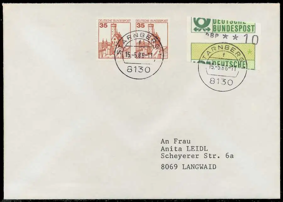 Normalbrief mit ATM1-010, sogenannter "Starnberger Reiter bzw. Starnberger Springer", beiliegend Quittung des Automaten mit Datum 15.05.1986, zusätzlich 35 Pfg waagerechtes Paar aus der Serie Burgen und Schlösser.
