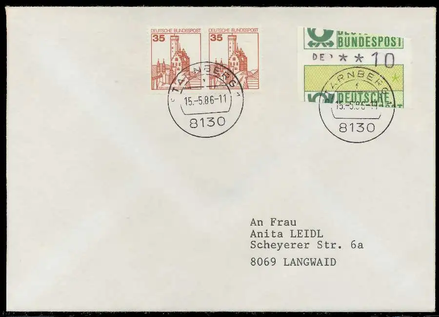 Normalbrief mit ATM1-010, sogenannter "Starnberger Reiter bzw. Starnberger Springer", beiliegend Quittung des Automaten mit Datum 15.05.1986, zusätzlich 35 Pfg waagerechtes Paar aus der Serie Burgen und Schlösser.